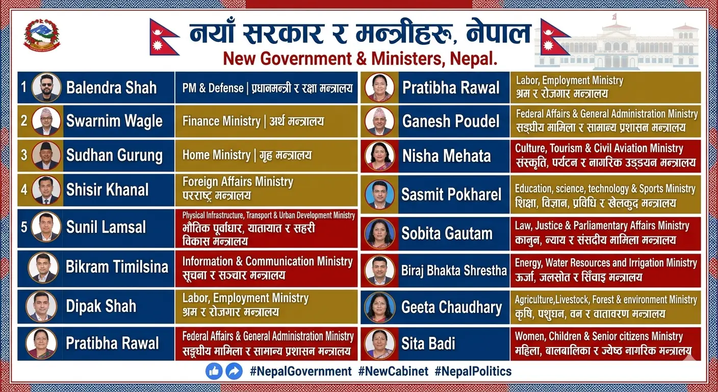 वर्षौँदेखि एउटै अनुहार र पुरानै कार्यशैली देखेर थाकेका नेपाली आँखाहरूले आज एउटा फरक र आशालाग्दो चित्र देख्न पाएका छन्। आज सार्वजनिक भएको नयाँ मन्त्रिमण्डलको सूचीले केवल सरकार परिवर्तनको मात्र होइन, एउटा नयाँ राजनीतिक युगको सुरुवातको सङ्केत गरेको छ।